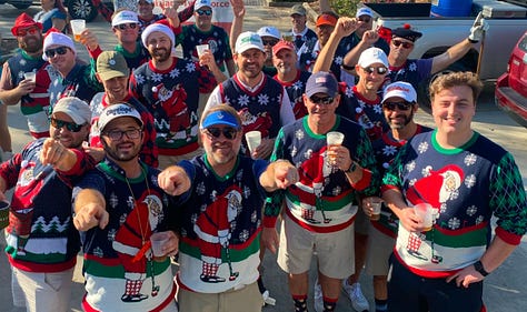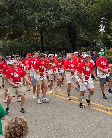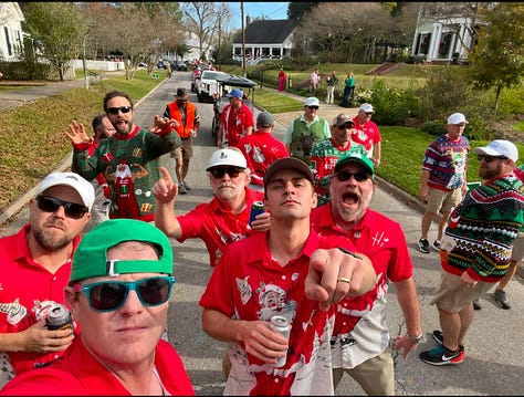 We live in a town that still has homecoming parades down main street (Ferdinand St.) and still has a Christmas Parade on the first weekend of December during the “Christmas in the Country Festival”. I have lived in a few towns in my life that carry varying degrees of self-importance4, and St. Francisville is definitely on that spectrum. But St. Francisville maintains a refreshingly solid base of not-taking-itself-too-seriously. One of the clearest evidences of that is the collection of guys that show up to do the Christmas parade each year. Local businessmen, Doctors, Lawyers, Bank Presidents, Town Officials, Retirees, Engineers, Priests, Pastors, Farmers, TeeTotallers, TooMuchers, you name it. Catholic, Presbyterian, Baptists, Episcopalian, some who claim all and some who claim none.