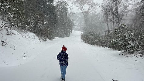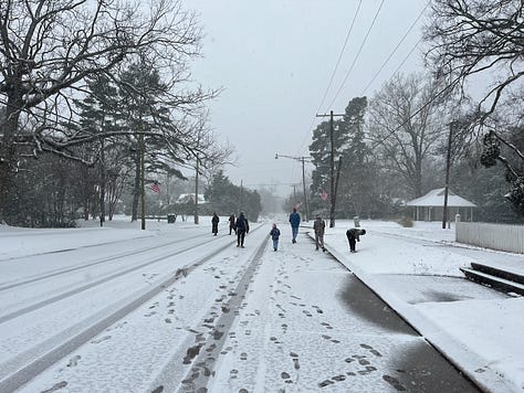 We got the rare snow day here in south Louisiana. First we walked around in our front yard repeating the phrase, “this is unbelievable” every few minutes. Soon we saw a bundled stranger turning on to our street from Commerce Street. He gave the cliche cajun “ayeeee” and said, “seems like its still comin’.” I replied cordially, saying “its unbelievable,” but soon realized it was our friend Father Brad from the Our Lady of Mt Carmel Catholic Church. He had walked in the snow from the rectory (2 miles). We couldn’t have been more pleased to see him. I apologized for not seeing his text pulling out my phone to see no unread messages.