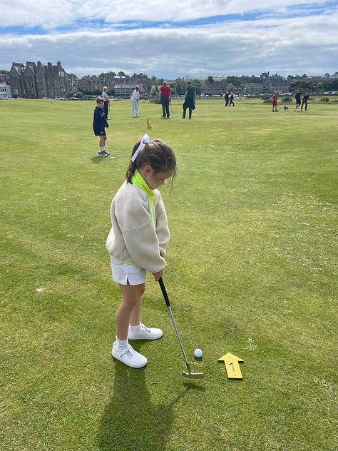 If you’ve heard of any putting course in Scotland, you’ve heard of The Himalayas Putting course at St. Andrews. You can learn about it many other places, so I will spare you those details. We played it, it was scenic, fun, and famous, but was not always easy to get on, and could feel rushed if crowded. My favorite part of that experience was that the 5 of us carried our own putters all the way from our borrowed flat on Alexandra Ct. across the 18th and 1st fairways of the Old Course to play golf as a family in St. Andrews. No “hiring” equipment from the St. Andrews Ladies’ Putting Club starter shed, we came prepared. We simply needed a tee time and a scorecard.